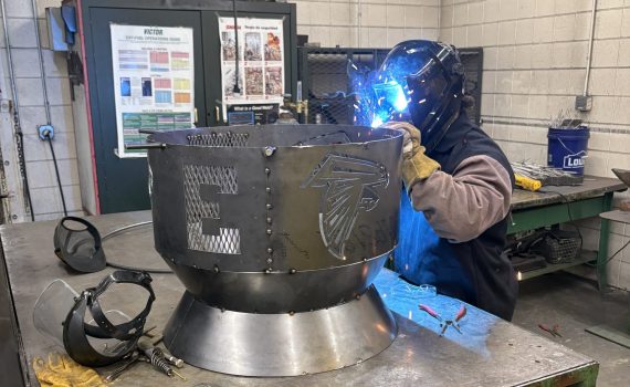 Elmira High School junior Michael Stovall welds a firepit that was awarded as a prize during recent CTE tours on campus.